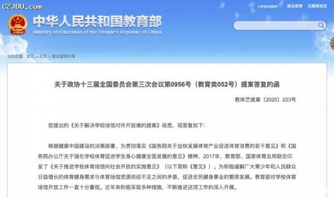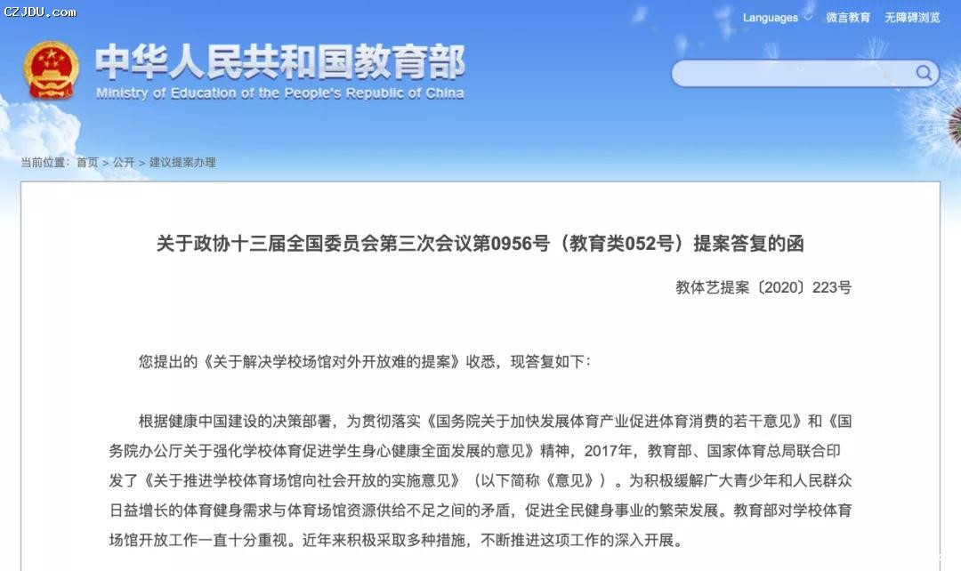 对学校体育场馆开放工作,教育部表示将继续推进学校体育场馆向社会开放。按照政府统筹、多方参与,因地制宜、有序推进,校内优先、安全为重,服务公众、体现公益的原则,通过明确场馆开放学校的基本条件和场馆开放时间,合理确定开放对象和开放场馆名录等措施,大力推进学校体育场馆向社会开放,有效缓解广大青少年和人民群众日益增长的体育健身需求与体育场馆资源供给不足之间的矛盾,促进全民健身事业的繁荣发展。